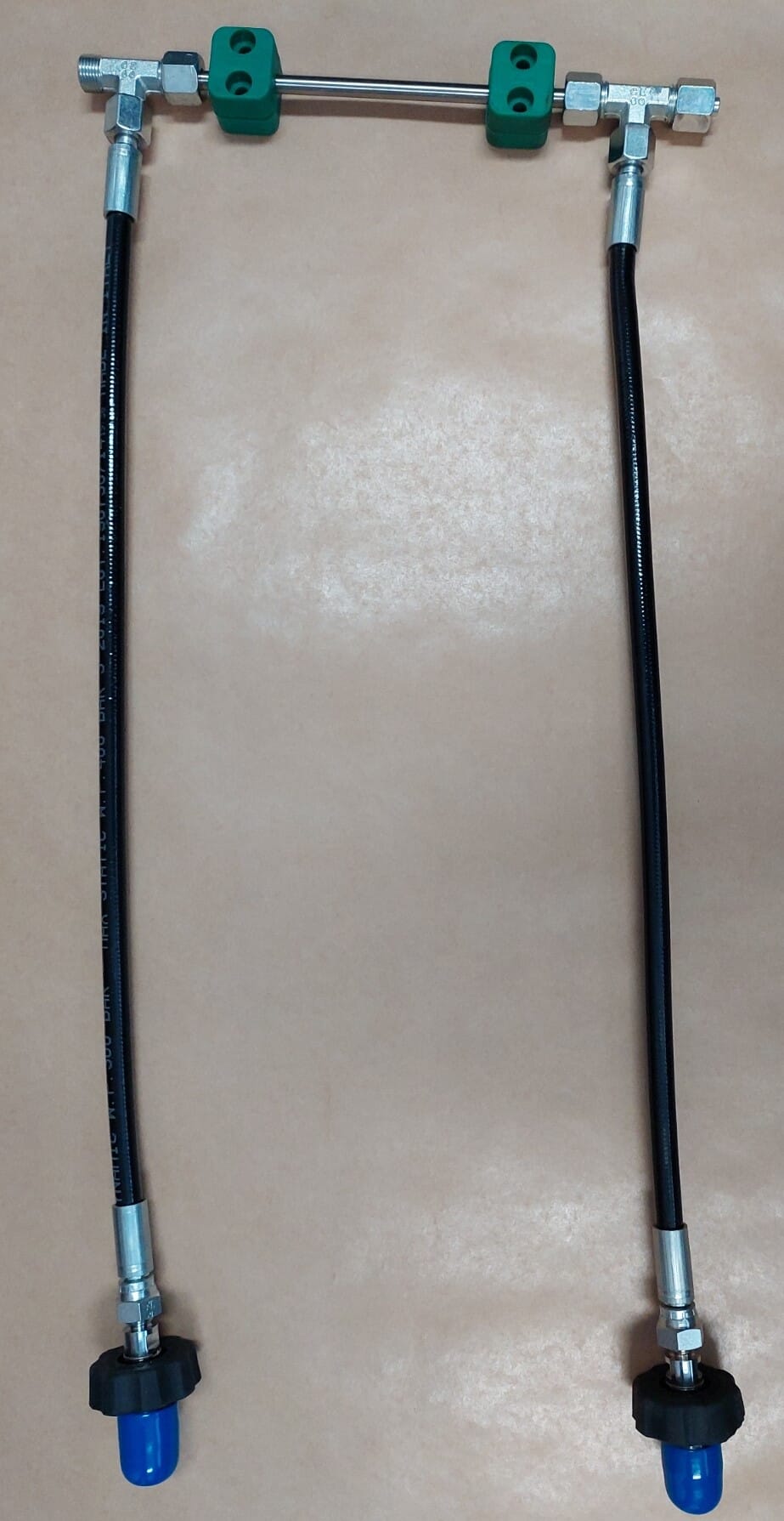 Grenrør for montering av flaskebank. Hvert element består av DIN kobling, 50 cm høytrykkslange, T-stykke, festeblokker for vegg (uten skruer, disse må tilpasses veggen) og rør til neste grenrør. Det siste grenrøret fått blindplugg istedenfor rør, slik at den er klar for utvidelse av banken.